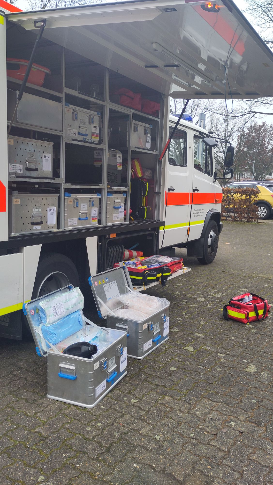 Dafür kamen drei Helfer der DRK Stadtbereitschaft Karlsruhe mit diesen beiden Fahrzeugen zu uns an die Schule, stellten uns diese vor und beantworteten uns alle Fragen. Beides sind Fahrzeuge des Katastrophenschutzes Baden-Württembergs und werden im Katastrophenfall durch ehrenamtliche Helfer und Helferinnen besetzt. Der GW San ist ein großes Auto, welches mit viel medizinischem aber auch technischem Material ausgestattet ist, um eine sogenannte Patientenablage oder einen Behandlungsplatz in Betrieb zu nehmen.